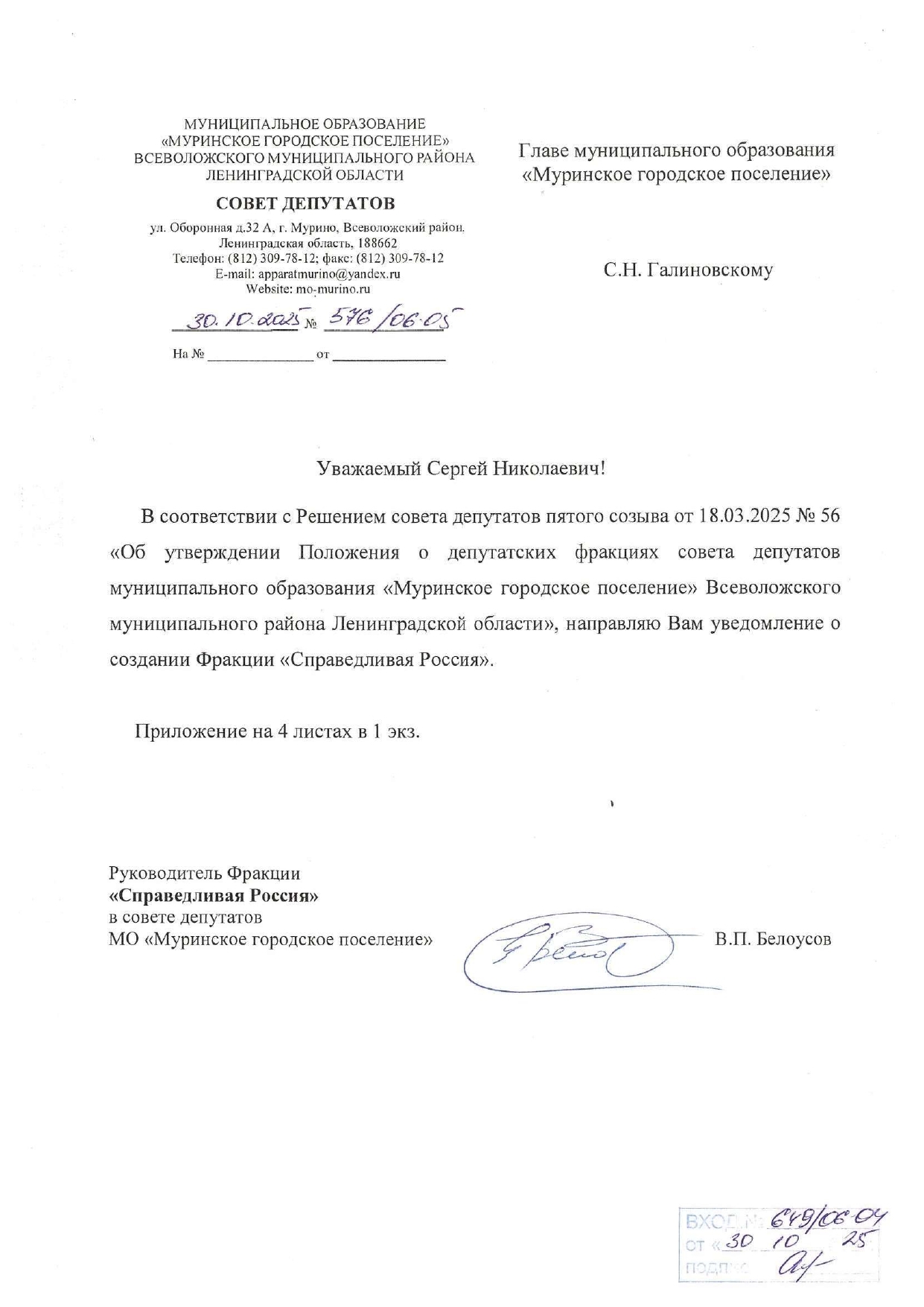 30 октября 2025 года в муниципальном образовании "Муринское городское поселение" Ленинградской области создана фракция Социалистической политической партии СПРАВЕДЛИВАЯ РОССИЯ. Возглавил фракцию Виктор Белоусов.